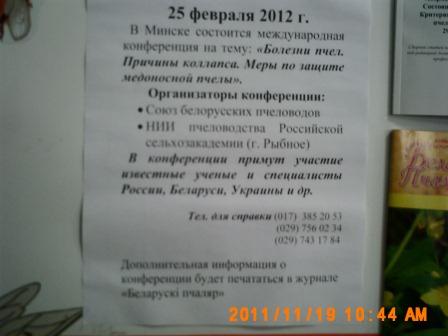 | 25 февраля 2012 г. Союз белорусских пчеловодов проводит в Минске международную конференцию на тему: «Болезни пчел. Причины коллапса. Меры по защите медоносной пчелы». Организаторы конференции: • Союз белорусских пчеловодов • НИИ пчеловодства Российской сельхозакадемии (г. Рыбное) В конференции примут участие известные ученые и специалисты России, Беларуси, Украины, Болгарии и др. Конференция состоится по адресу ул. Берсона,16 (здание Министерства жилищно-комунального хозяйства РБ) Начало в 10.00